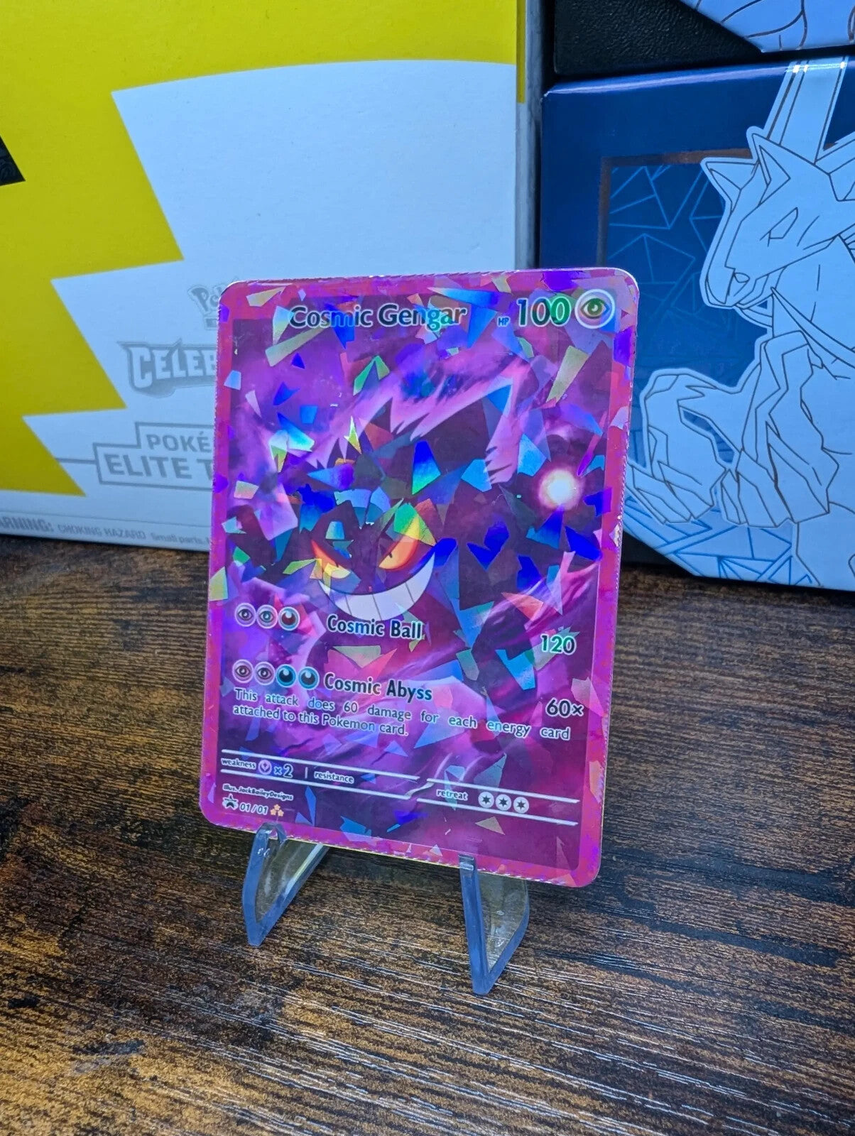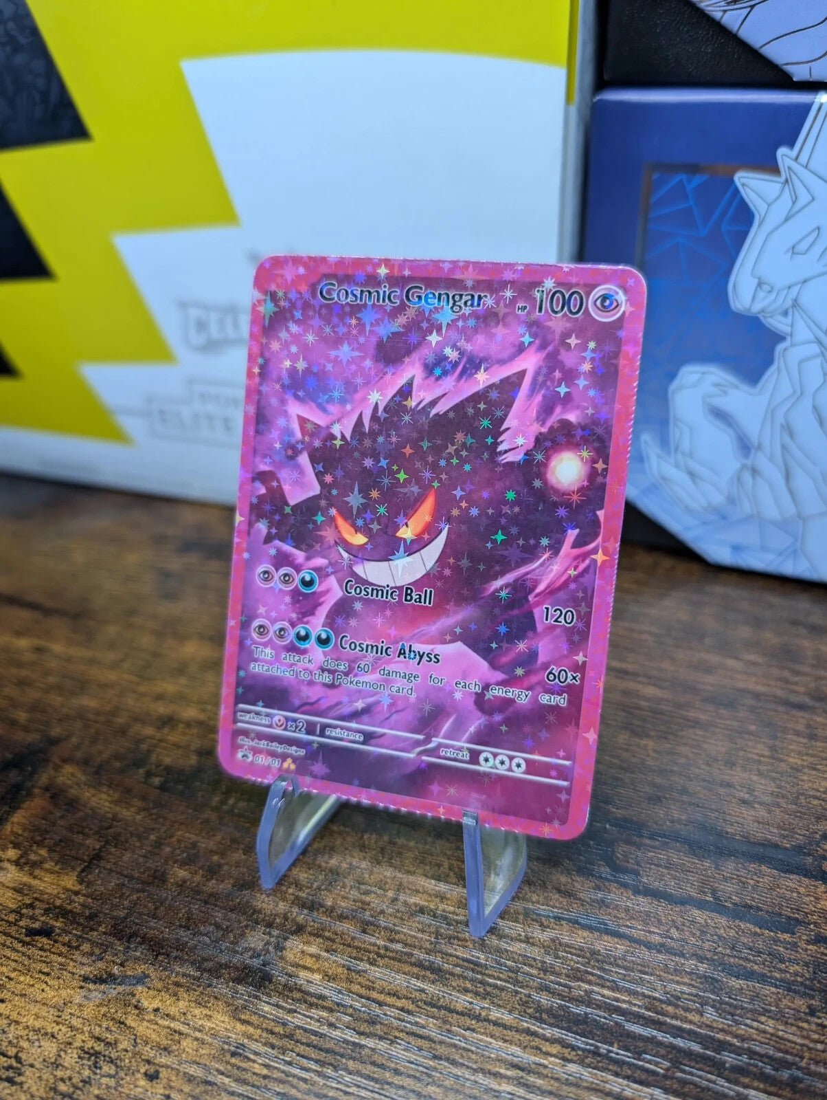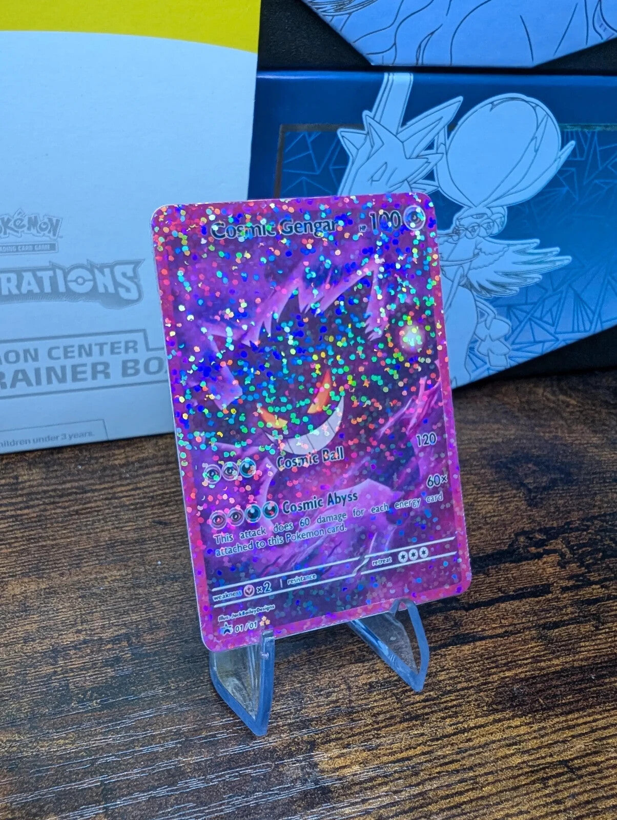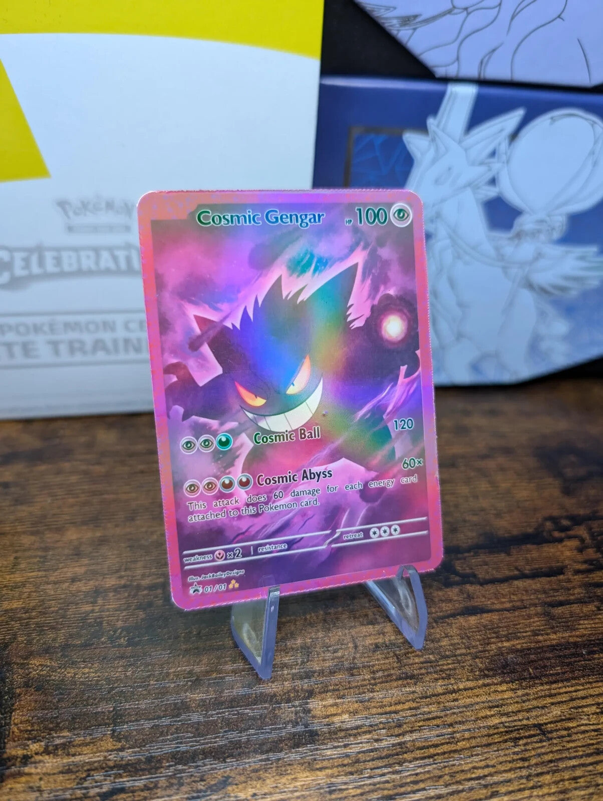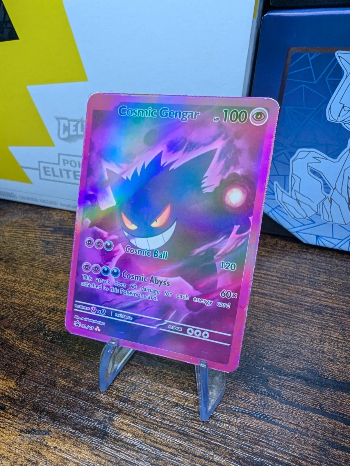 The custom Cosmic Gengar Pokemon card is a Holo Rare card from the Pokémon TCG featuring Gengar in a full art design. This unique card is a special addition to any collector's deck, showcasing the iconic character in a cosmic-themed artwork that is sure to stand out in your collection. Perfect for fans of Gengar or collectors of rare Pokémon cards, this card combines the mystical allure of Gengar with the captivating appeal of a full art design, making it a valuable and sought-after piece for any trading card enthusiast.