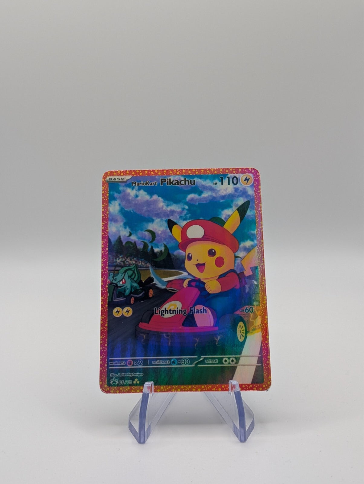 Rev up your collection with this rare custom crossover card — Pikachu hits the track in Mario Kart style! A must-have for Pokémon and Nintendo fans alike, perfect for display or as a unique collector’s centrepiece.